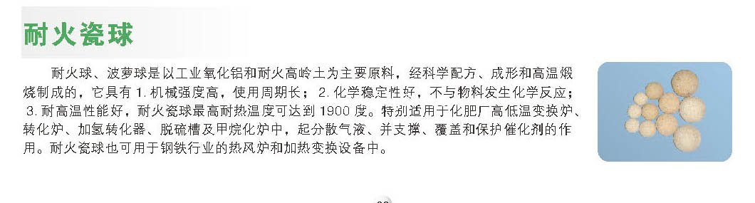 3. 耐高溫性能好,耐火瓷球高耐熱溫度可達(dá)到 1900 度。特別適用于化肥廠高低溫變換爐、轉(zhuǎn)化爐、加氫轉(zhuǎn)化器、脫硫槽及甲烷化爐中,起分散氣液、并支撐、覆蓋和保護(hù)催化劑的作用。耐火瓷球也可用于鋼鐵行業(yè)的熱風(fēng)爐和加熱變換設(shè)備中。耐火瓷球分普通耐火球和高鋁耐火球,普通耐火球適用于硫酸和化肥行業(yè)的轉(zhuǎn)化器和變換爐,高鋁耐火球適用于尿素、鋼鐵等行業(yè)的熱風(fēng)爐、加熱變換爐等設(shè)備。本站還有介紹陶瓷散堆填料。